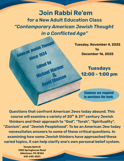 Join Rabbi Re'em for a new Adult Education Class - Contemporary American Jewish Thought in a Conflicted Age. Questions that confront American Jews today abound. This course will examine a variety of 20th and 21st century Jewish thinkers and their approach to 'God', 'Torah', 'Spirituality', 'Zionism' and 'Jewish Peoplehood'. To be an American Jew today necessitates answers to some of these critical questions. In examining how some Jewish thinkers have approached these varied topics, it can help clarify one's own personal belief system.
