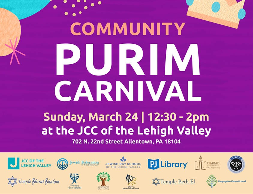Join the community at the JCC to celebrate Purim with games, prizes, a bounce house, and more. All ages are invited, and there's no charge to attend. Food will be available for purchase. For more information, contact Jackie Weiss at [email protected].