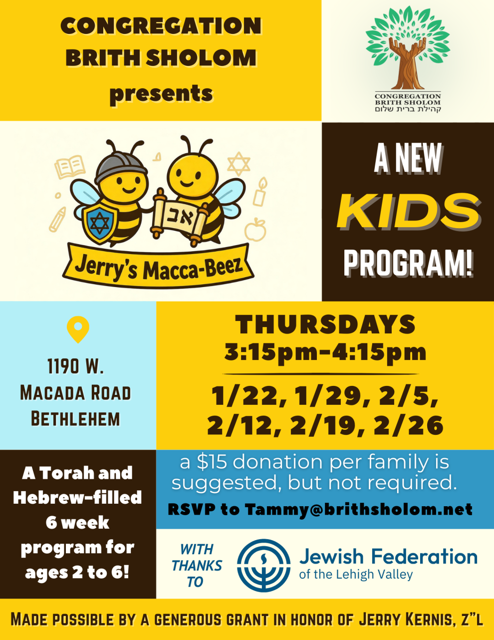Jerry’s Macca-Beez is a new Torah and Hebrew-filled 6-week program for ages 2-6 at Congregation Brith Sholom in Bethlehem. Thursdays,1/22, 1/29, 2/5, 2/12, 2/19, 2/26 from 3:15pm-4:15pm.
