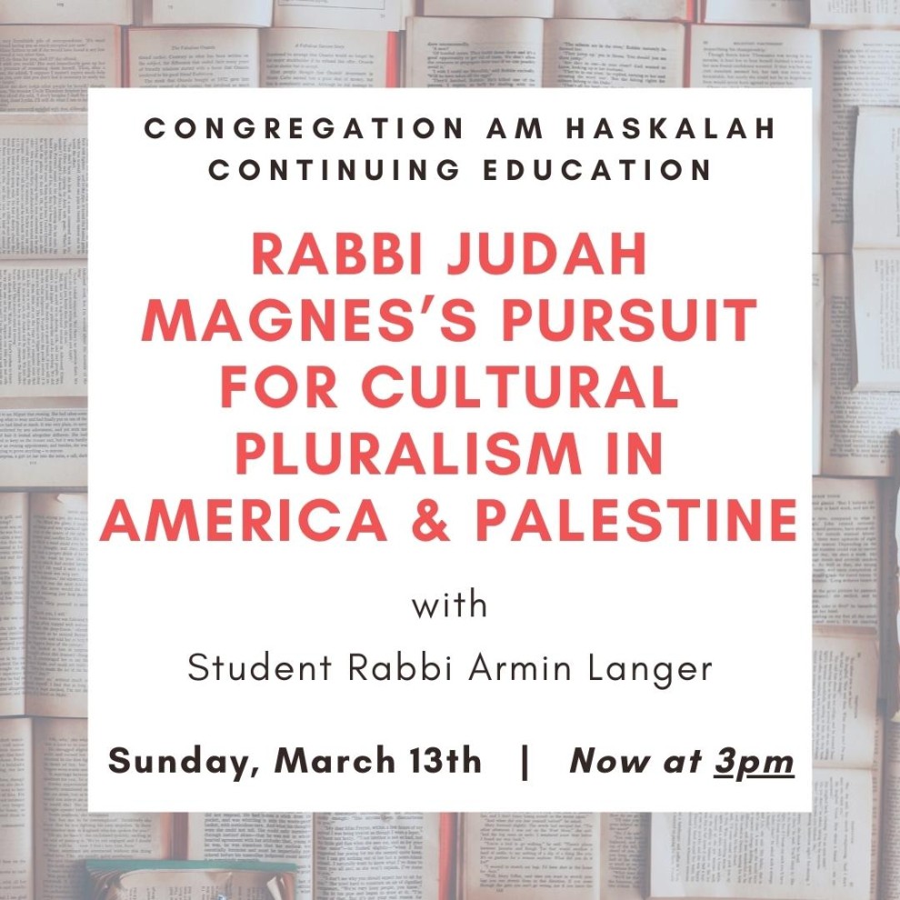 Join Am Haskalah Continuing Education as we learn about Rabbi Judah Magnes with Student Rabbi Armin Langer. Free and open to all, on Zoom.