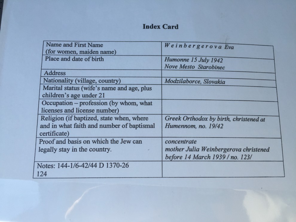 Eva Levitt’s father, who owned and operated a lumber business, was deferred from deportation because his labor was needed for the war effort. During this time he asked a school friend of Eva’s mother – Geza Haytas – for help in acquiring false papers, which the Haytas family (with whom the Levitts maintained contact throughout the years) did. Geza also found a small room where they could live, telling people that Eva’s mother was his cousin and her husband was in the army. She, like Derby’s mom, worked as a domestic. Though Levitt’s father also had false papers, he knew they wouldn’t prove useful if he were forced to show he was not circumcised. Not wanting to risk revealing the identities of his wife and daughter, he did not carry them. When his service at the lumber yard was no longer needed he was deported to Auschwitz.