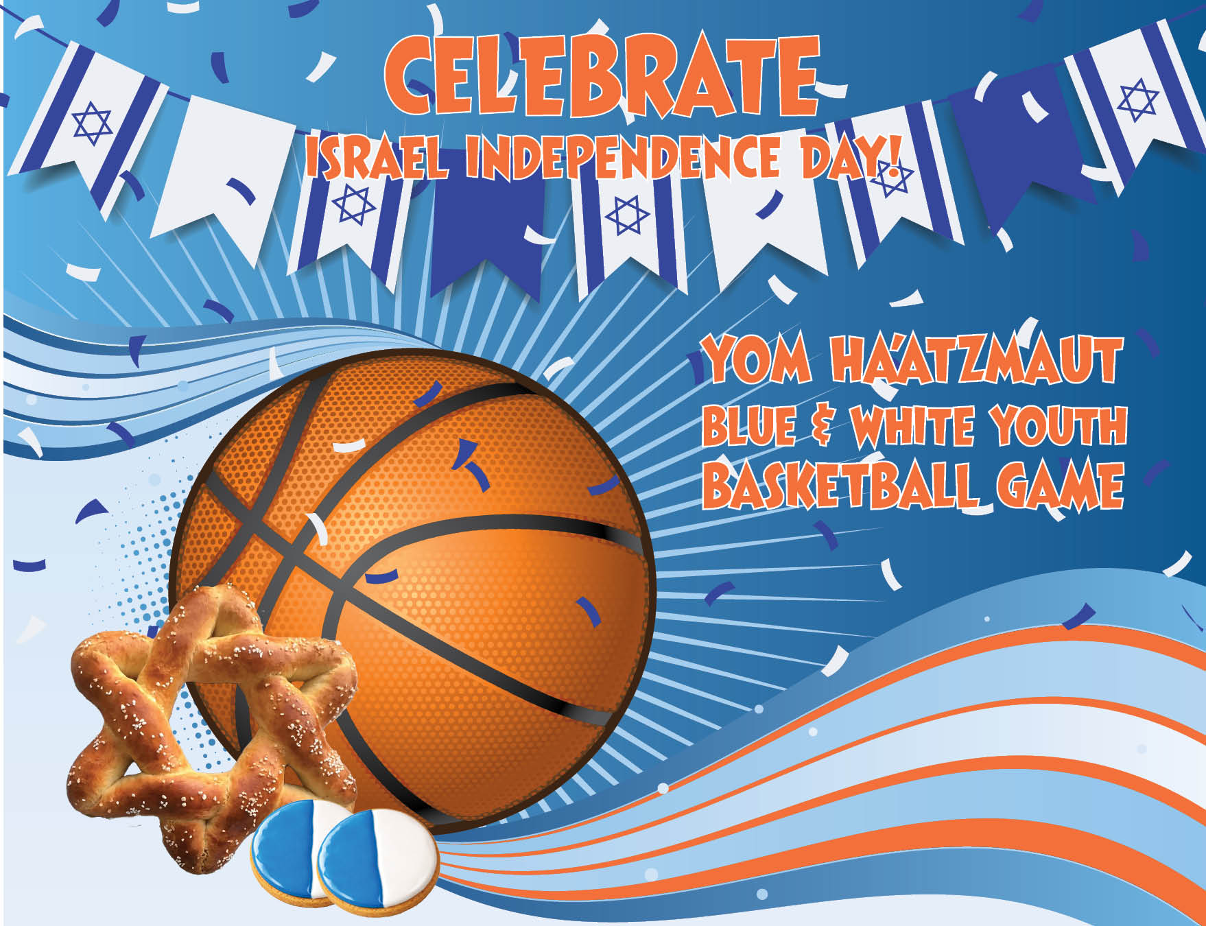 Join us to celebrate Yom Ha’Atzmaut with a friendly youth basketball game featuring kids from the Jewish Community Center and the Jewish Day School. The halftime performance will showcase the JDS Flag Dance! Magen David soft pretzels and blue and white cookies will be available as grab ‘n go.