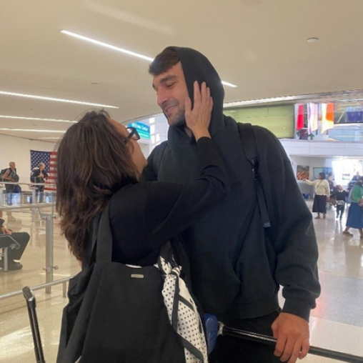 Sam is greeted by his mother, Donna, upon landing back at Newark Airport.