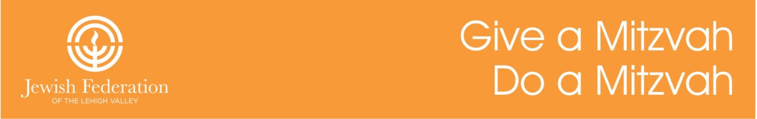 GIVE A MITZVAH, DO A MITZVAH is an initiative of the Jewish Federation of the Lehigh Valley that was created to offer young adults a resource for mitzvah projects and tzedakah opportunities for their B’nai Mitzvah year and beyond. Your child may choose to donate to the Jewish Federation of Lehigh Valley Annual Campaign and/or to develop a hands-on social action project.