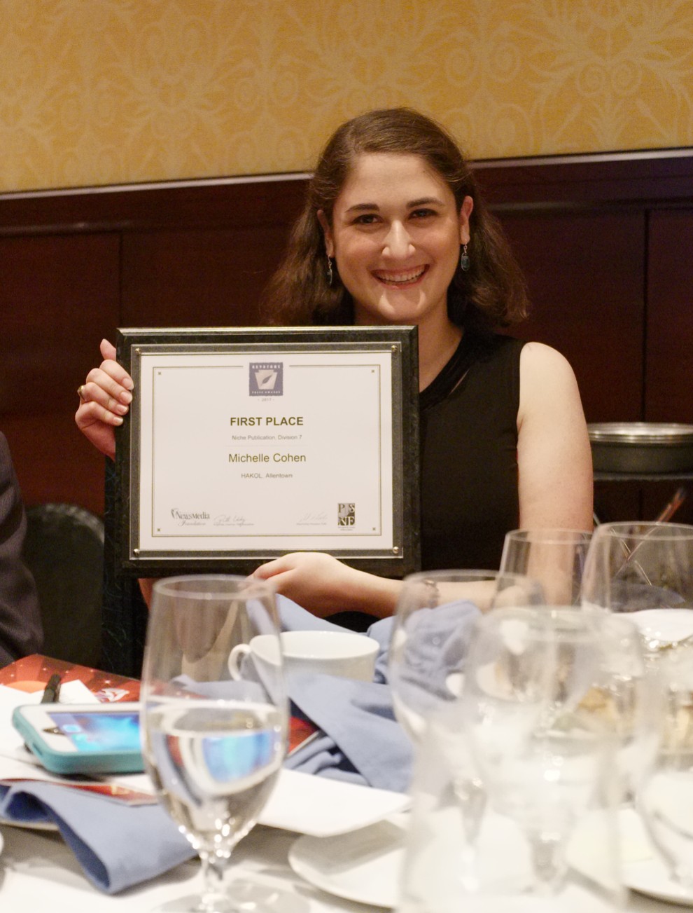 HAKOL editor Michelle Cohen accepted the paper’s first place award for "niche publication" in its division in the Keystone Press Awards, sponsored by the Pennsylvania NewsMedia Association Foundation. The two goals of the award, according to the website, are to “reinforce excellence by individuals in the news media profession, by recognizing journalism that consistently provides relevance, integrity and initiative in serving readers, and faithfully fulfills its First Amendment rights/responsibilities,” and to “stimulate journalists to improve their craft and ultimately improve their community.”