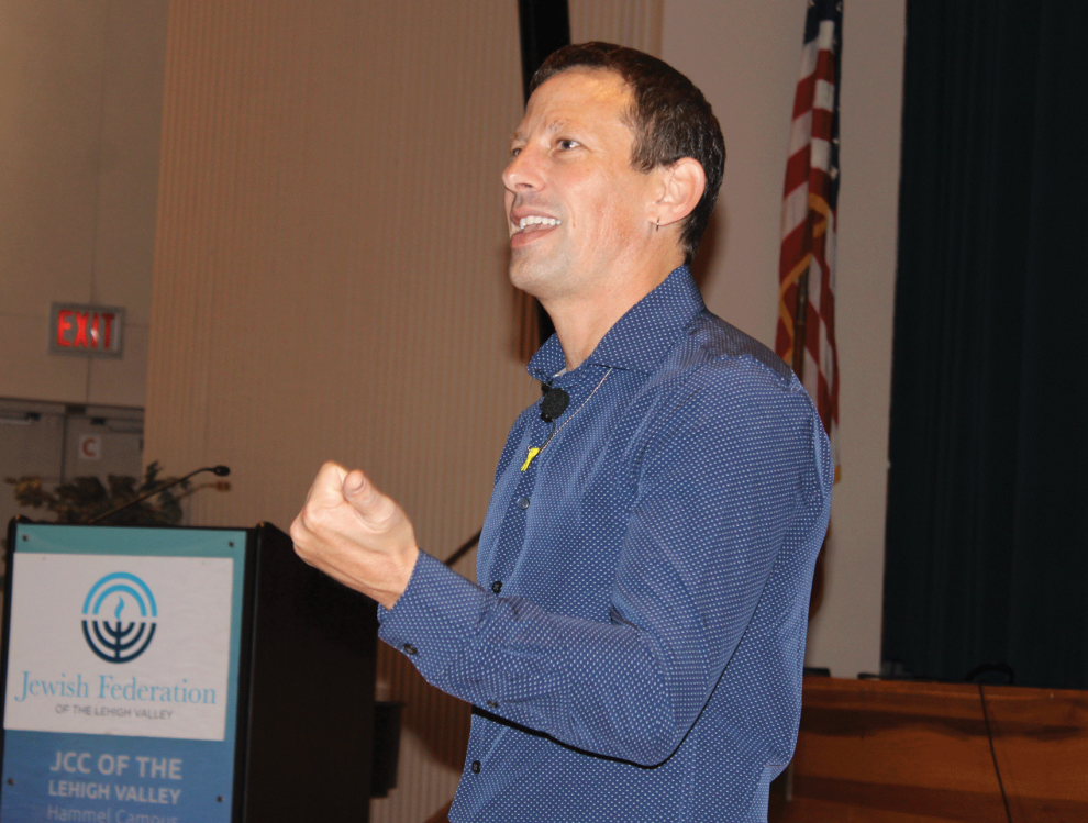 The commemoration event, presented by NextGen of the Jewish Federation of the Lehigh Valley, began with an exhibit of images that Israeli photojournalist Erez Kaganovitz shot after October 7. The “Humans of October 7th” exhibit built on his previous “Humans” exhibits and the 3,000 people he’s put on film for them, inspired by the “Humans of New York” photoblog and book series that brings together photos of people and places with first-person stories that together provide glimpses into their lives, the places they call home, and their situations.