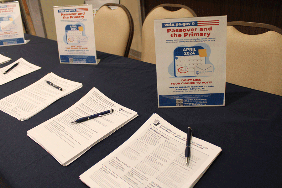 The Jewish Federation of the Lehigh Valley had a table set up in the JCC lobby all day on February 27 to help community members request mail-in ballots. State government forms were available for requesting a ballot and for designating someone as your legal agent to help you to obtain and return your filled-out ballot, as well as for registering to vote. Federation staffers provided help filling out these forms to anyone who wanted it.