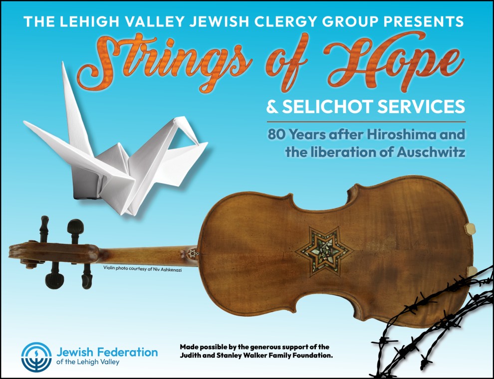 This Strings of Hope evening is made possible through the support of the Judith and Stanley Walker Family Foundation in partnership with the Jewish Federation of the Lehigh Valley, the Lehigh Valley Jewish Clergy Group, Udi Bar-David, and Miko Green, representative of the Japan Society of New York.
