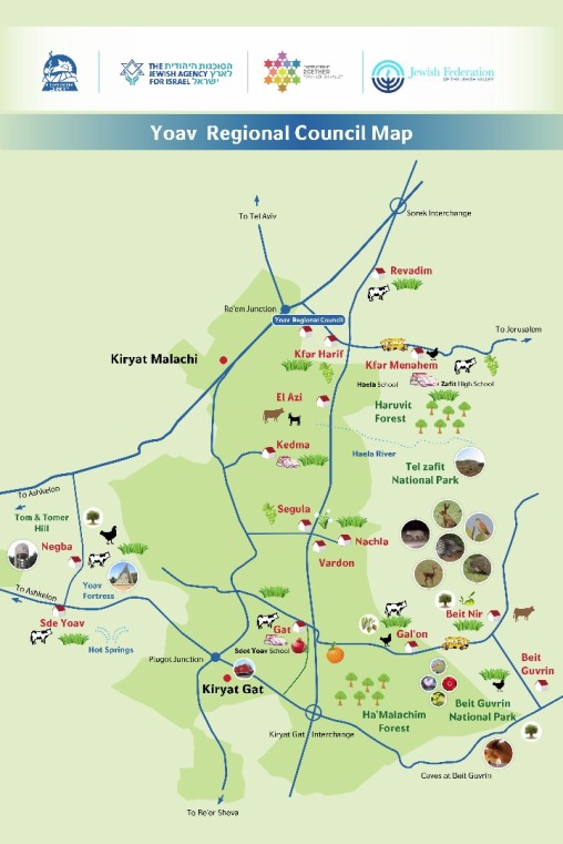 The Yoav Regional Council was established in 1952. It contains 14 communities, primarily kibbutzim and moshavim, and has around 7,000 residents. Its area stretches from Re’em Junction in the north to Kiryat Gat in the south, Beit Govrin to the east and Givati Junction in the west.