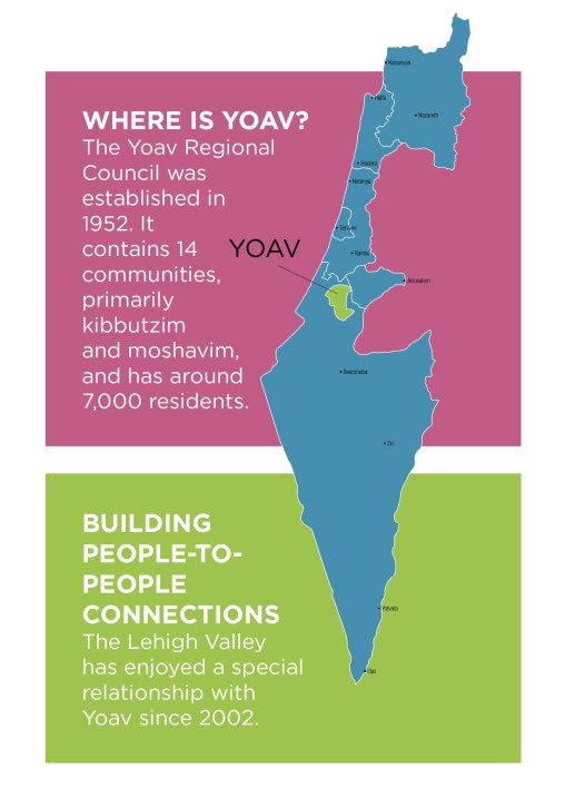 Each year, our partnership community sends teens to Camp JCC in the Lehigh Valley and hosts missions and visitors from the Lehigh Valley. The partnership supports a number of projects in Yoav in the fields of Jewish renewal, leadership development and community empowerment. The partnership is headed by a steering committee of volunteers from Yoav communities and volunteers from the Lehigh Valley.