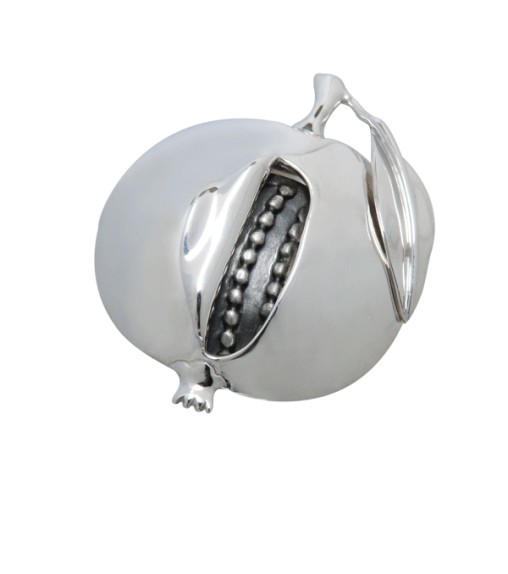 An ancient symbol found carved into the lintels of the earliest synagogues, the pomegranate has carried with it the concepts of Judaism for generations. In the Torah, the pomegranate is one of the seven species that the spies saw in the land when they were sent forth by Moses. The Midrash tells us that the pomegranate has 613 seeds, which corresponds with the number of mitzvot or commandments found in the Torah. The pomegranate has been woven into ancient fabrics and hammered into ceremonial silver and gold objects. The intricate covers for the handles of the Torah scrolls are called "rimonim" or pomegranates.