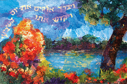 Levin has also created a variety of Jewish objects with silk painting, including tallitot, challah covers and a chuppah for her son and daughters. The intricate process involves stretching the silk, tracing the design, painting with dyes, steaming for two hours, washing out any excess dye and finally quilting it. Beading is also involved in some of her more intricate pieces. In addition to creating Jewish art, Levin enjoys representing natural scenes and fish, like the ones in her koi pond. Whatever the project, “I feel happy when I’m creating,” she said.